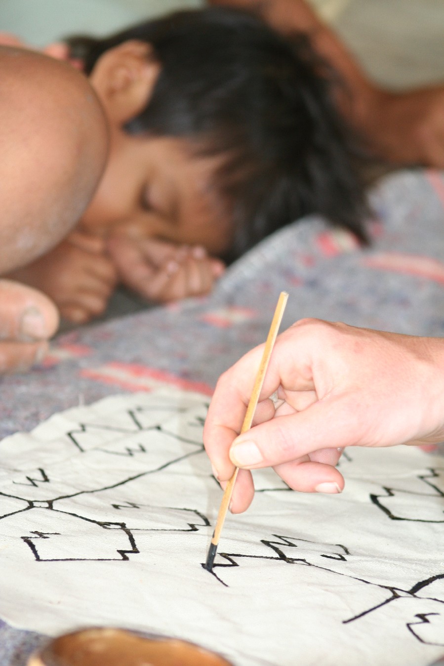 One of the things done on the Yine Tour is to paint traditional designs on cloth. Berta paints, and I mirror her drawings. I selected the design painted when they went to war. Her children and grandchildren and mother look on. Later, Berta painted warrior images with Huito, a rainforest plant, on my arm. Daline and I were guerreras de Amazonica! Warrior women! Similar to henna, the design stays for several days.